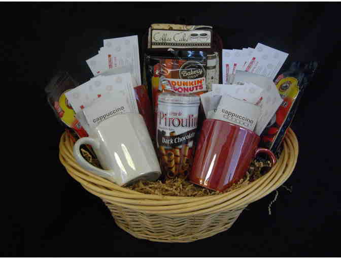 4 ceramic Starbucks coffee cups with a select blend of coffee and cappuccino flavors including hazelnut, French vanilla, Chocolate glaze, mocha and regular with Creme de Piroulin dark chocolate rolled wafers and 24 certificates for a free donut and coffee at Shipley's Donuts.