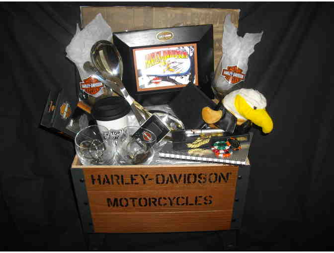 For those that ride the Steel Horse, this basket has a little of everything from Mancuso Harley-Davidson that you could want. Packaged in a wooden Harley-Davidson Motorcycles chest you have; two wine glasses, salad tongues, travel coffee mug, leather wallet, picture frame, stuffed screaming eagle, tumblers, napkin ring holders and a Harley journal and pen to keep track of all the adventures.
