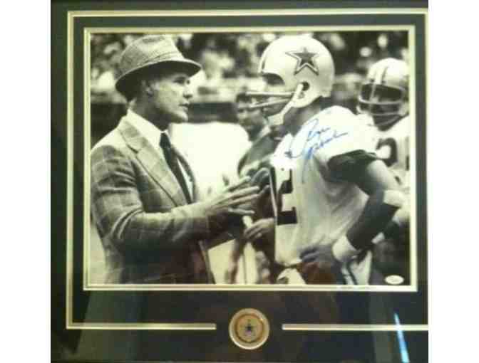 Signed 16x20 b&w from this Dallas Cowboy Hall of Famer. Photo includes Roger and Coach Tom Landry.