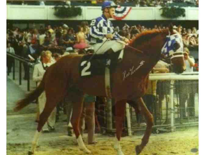 Signed by jockey Ron Turcotte who rode SECRETARIAT to a 31 length win at the Belmont Stakes, thus winning The Triple Crown in 1973. 16x20 color photo custom framed.