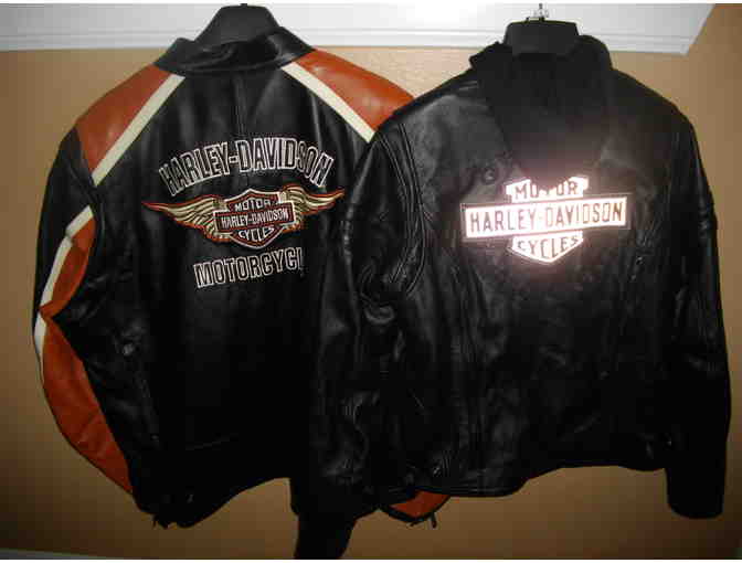 His and Hers Harley Leather Jackets - Classic cruiser leather jackets. Midweight premium leather, removable liner and venting system, leather applique and embroidered graphics. Sizes exchangeable within 90 days of the Gala.