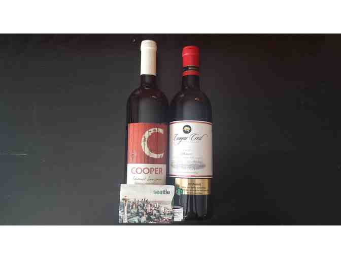 One bottle of Cooper Cabernet Sauvignon, one bottle of Cougar Crest Merlot and a $25 Starbucks gift card.