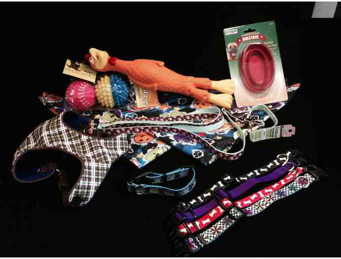 Make your pint-sized pooch feel like a big star with this assortment of 6 collars, a leash, a padded harness, brush and toys!