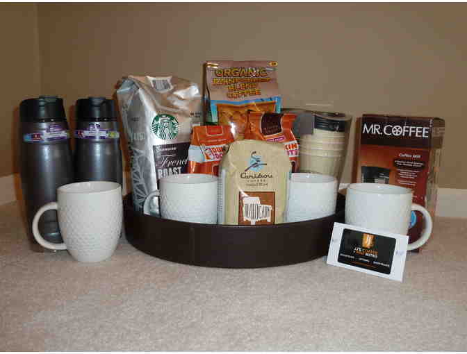 Coffee, coffee and more coffee! Various types of beans and blends come with this basket, along with a new coffee grinder, two travel mugs, four ceramic coffee mugs, to-go cups, and a $10 JJ's Wine and Coffee gift card.