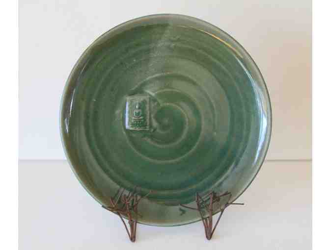 G A green wheel-thrown clay platter with a buddha stamp on it. A beautiful serving platter for all foods!