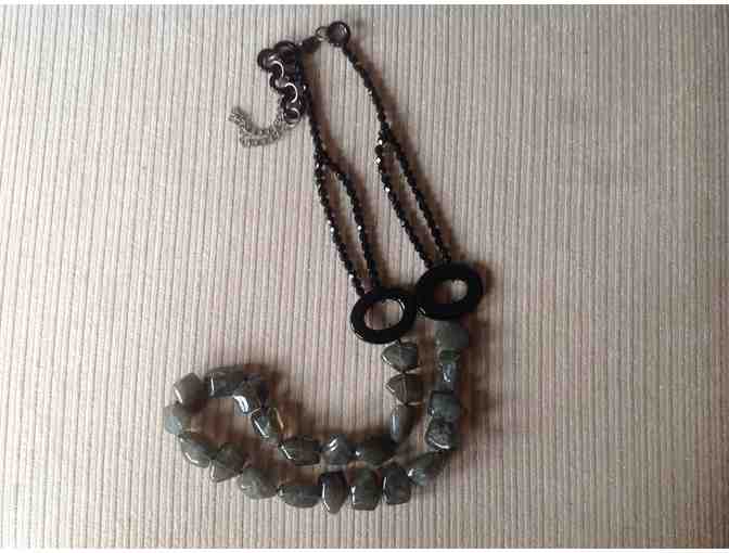 Long Ladro necklace with grey beads and black accents. Approximately 30 inches in length with adjustable clasp.