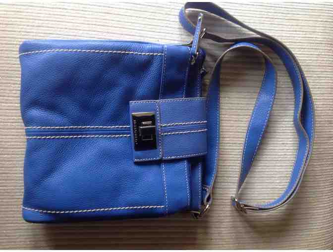 Approximately 6 inches by 8 inches with long adjustable strap and three major compartments including a central wallet organizer section with credit card and identification slots as well as room for currency. Appears to be leather. Still has original paper stuffing inside.