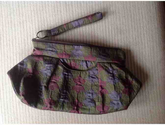 Handmade grey green and purple material clutch by Maruca of Boulder, Colorado. Purchased from the deCordova Museum gift shop. Approximately 5 and 1/2 inches by 11 inches. Appears to be silk.