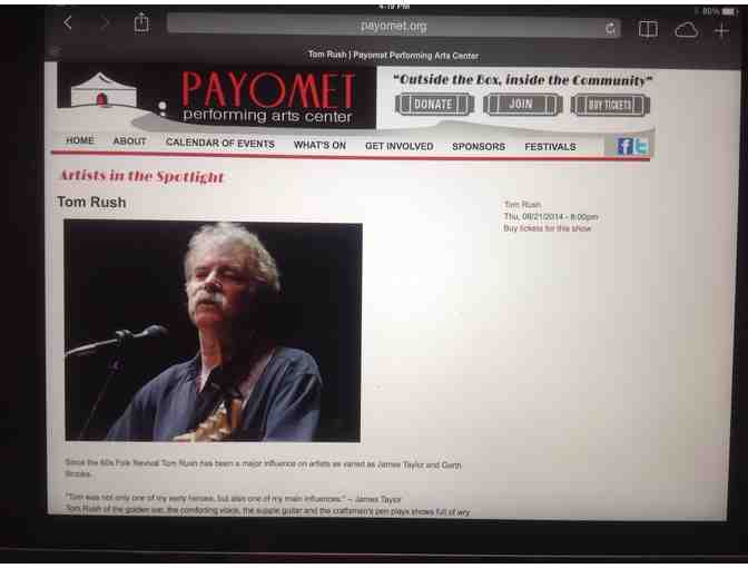 2 VIP meet and greet tickets to see Tom Rush in concert at the PAYOMET Performing Arts Center this summer in Truro on Cape Cod, Thursday, August 21st at 8pm. Seats are front row center stage (A-3 and A-4) and include the chance to meet Tom before the concert.