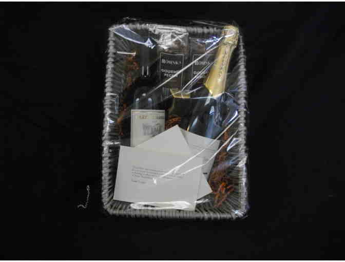 Bottle of Vouvaray bottle of Chateau Massiac, Gourmet Pecans and Almonds, a Gold Chocolate bar and a toast written to you. Enjoy!