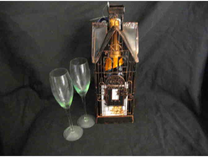 Metal House of Corks Cork Cage with a bottle of Monetto inside to get you started with your first cork and two champagne flutes. When you are ready to work on more, there is a $15 gift card to Cork Cafe inside to help you continue your cork collection.