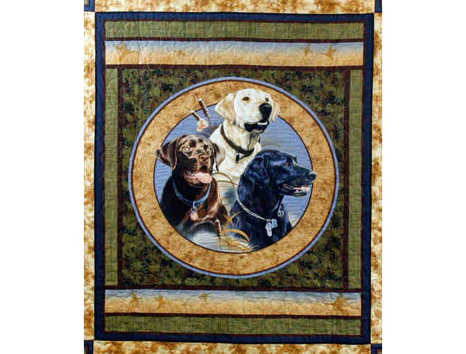 Beautiful quilt prominently featuring Black, Yellow, and Chocolate Labs. The back fabric is a collage of a variety of dog breeds. This quilt measures 59" x 66".