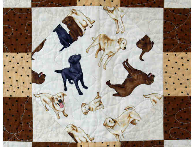 Lots of labs cover this quilt. Plus you'll find pawprints in the quilting. The back fabric is a solid cream color. The quilt measures 50" x 66".