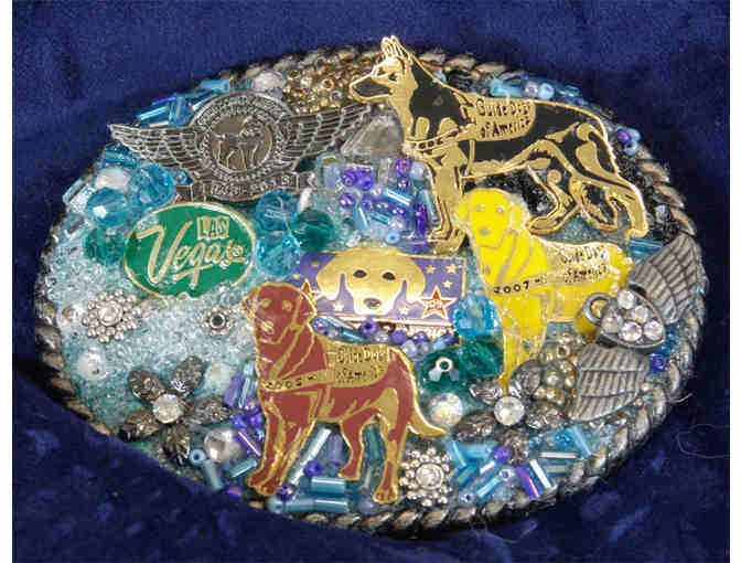 Our very own Grace Cohan created this beautiful belt buckle. It's decorated with GDA lapel pins from the past and lots of sparkle.