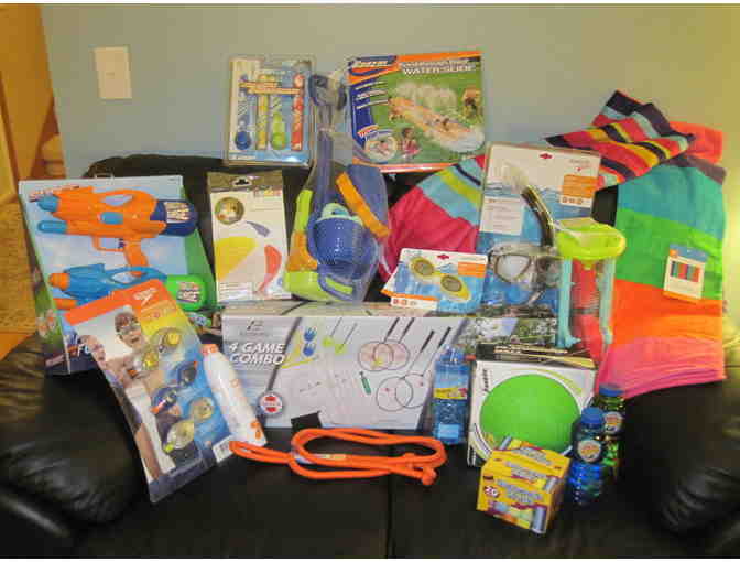 Slip and Slide, 2 Water Guns, Diving Sticks, Beach Ball, 2 sets of sand toys, 4 pair of swim goggles, snorkeling set, 2 beach towels, jump rope, sun screen, bubbles, sidewalk chalk, playground ball, 4-game combo set (volleyball, badminton, lawn darts and magic smash), water balloons & "s'mores fixings" (chocolate, marshmallows and graham crackers).