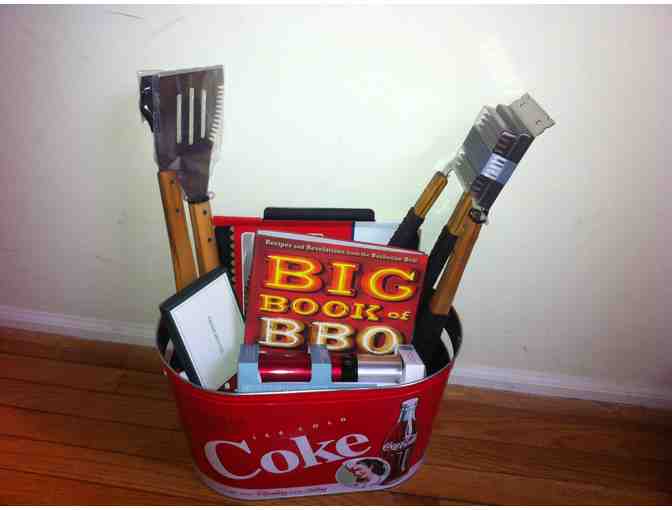 Vintage Coca-Cola beverage tin filled with southern bbq essentials. Atlanta own's Fox Brothers BBQ sauces and rubs, grilling tools, apron, tablecloth and $100 gift card from William Sonoma to get you ready for the grilling season.