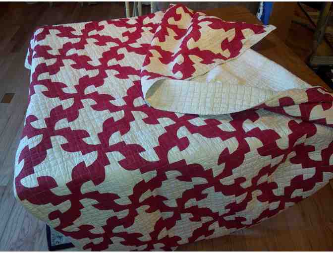 This quilt circa 1940 in the drunkard's walk pattern in red and white measures 69 x 80 inches. Donated by Susan Fogg, proprietor of Charlton Classic Interiors & Antiques.