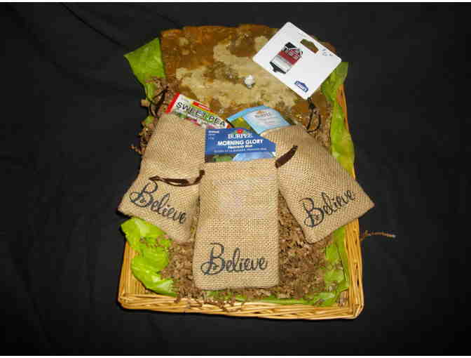 Start your own rock oasis in your back yard with this Rock Candle, citronella oil and funnel for filling. Basket also comes with a $50 Lowes gift card and three mini burlap sacks filled with seeds to enhance your rock oasis.