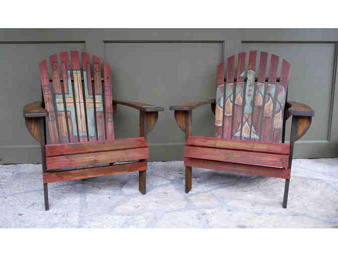 Two wood Adirondack chairs hand painted and stained with unique Indian symbols. The thunderbird symbolizes transformation and indomitable spirit while the “T” symbolizes paths crossing.