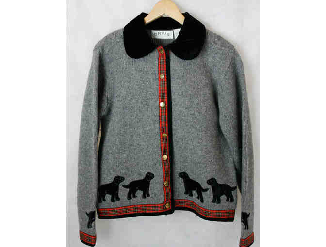 Luxurious Orvis wool sweater appliqued with adorable black lab puppies. The sweater is a womens size small.
