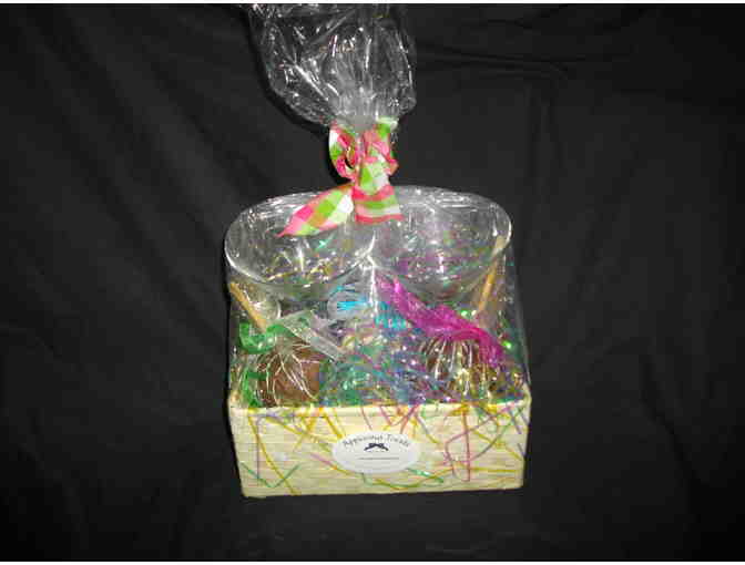Two chocolate covered apples and one white chocolate covered apple that deliciously sports the new SIRE logo. Two martin glasses stem from the middle of the basket.