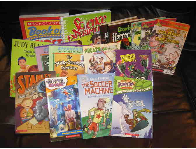 The Soccer Machine, Mr Magorium's Wonder Emporium, The Lightning Thief, The Mighty Miss Malone, Tales of a Fourth Grade Nothing, 2 books from "The Cul-De-Sac Kids" series, 2 reference books called "Science Experiments" and "Book of Firsts", 3 books from the "Black Lagoon Adventures" series, 1 "Scooby Doo" Junior Chapter Book, 2 "Goosebumps" books, 1 "Pirate School" book, 1 "Flat Stanley" book and 1 book from "Twisted Journeys". Note: 2 books not shown in photo.