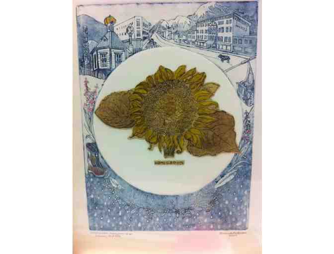 Dianne's piece Sunflower "Homegrown" is a zinc etching and crafted with Dianne's handmade paper of fireweed. The piece is 16" long X 12" wide with backing.