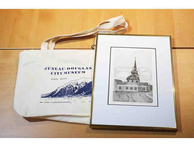 Grace your home with this print of the iconic Russian Orthodox Church in Stika , done by Juneau artist Laurie Ferguson Craig and donated by the Juneau-Douglas City Museum. The print is signed by the artist and is print 19/75. All package up sweetly in a museum tote.