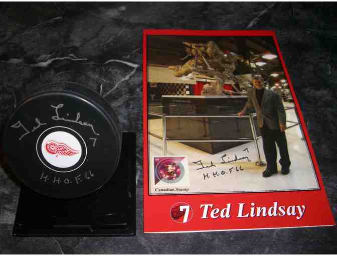TED LINDSAY SIGNED HOCKEY PUCK & SIGNED PICTURE CARD WITH BIO