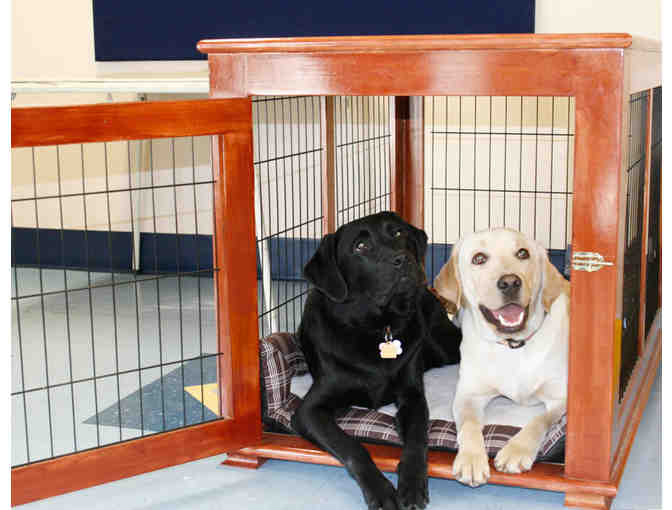 Gorgeous wooden dog crate. The crate has a solid bottom and comes with the bed as shown. Thanks to Captain and Latigo — no, they aren't included with the crate — for giving us a good example of just how spacious this crate is measuring 29"W x 46"L x 31"H.