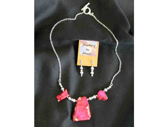 Lovely rose stone necklace and silver earrings by Jewelry by Dawn. The necklace is 18" in length; earrings drop of 1".