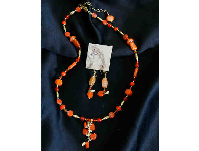 Beautiful orange necklace and earrings by Jewelry by Klew. The necklace is 19" - 22" in length with a 2" pendant; earring drop of 2".
