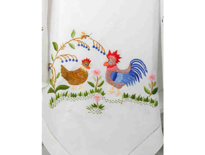 This table topper will brighten your room with it's beautifully embroidered roosters and hens. This was purchased in Paris, France at Le Blanc and donated to our auction. Measures 33" x 33" and is made of 100% cotton.