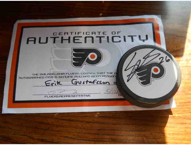 Puck autographed by Philadelphia Flyers defenseman Erik Gustafsson with certificate of authenticity dated May 13, 2014