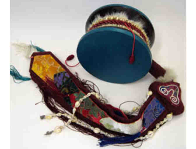 Tibetan chod drum, ornamented, with brocade tail and cover.