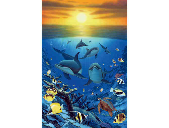 | Ocean Calling: The waters of our planet teem with life, from the thriving ecosystems of the tropical rain forest to the kaleidoscope of life among the world’s coral reefs. In “Ocean Calling,” Wyland pays homage to the creatures who depend on pristine marine habitats for their very survival. “The pod of dolphins in this painting represent the pinnacle of this important ecosystem,” Wyland says. “They’re incredibly intelligent. But like humans they depend on cooperation and a clean habitat to survive.” The lithograph is numbered and signed. |
