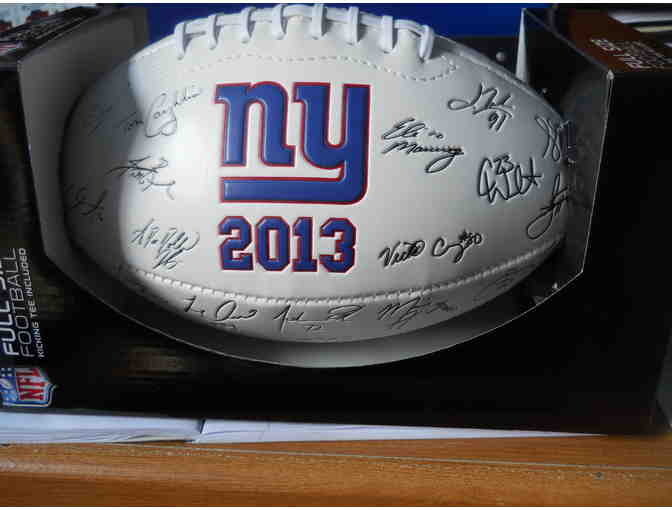 Limited edition (1,000 produced) football autographed by all members of 2013 New York Giants, including Eli Manning, head coach Tom Coughlin and general manager Jerry Reese. Includes kicking tee