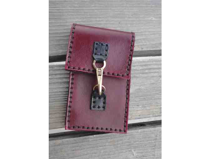 This item is made from genuine leather and is hand cut, dyed, and stitched. It is a dyed deep red and is lined with black suede. It was handmade by Maddie Lynch (an athlete on SU Rowing Team). The case fits all versions of the apple iPhone.