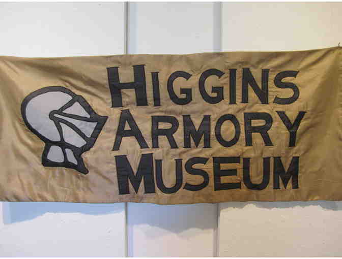 A 22.5 x 53.5 in. gold and black cloth banner with the Higgins logo which dates back to the 1970s. This piece comes with three historic photographs of the Armory and its collection, two small and one large.