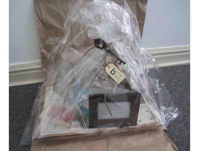 A beautiful gift basket filled with all your entertaining needs such as placemats and placecards, vintage cheese markers, wine charms, a key bottle opener, Veuve Clicquot Champagne, a burlap champagne bag, and more! Comes on a hand-designed reclaimed wood tray and includes a $25 gift certificate towards design services at B Adams interiors or a retail purchase at Birch Alley.