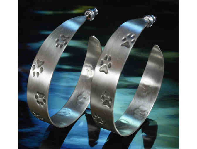 Sterling silver hoop earrings by Allan Mason. The hoops are 1.5" in diameter, Argentium tarnish-resistant sterling silver with surgical steel posts. The paws were created with the steel hand stamps made by Allan.