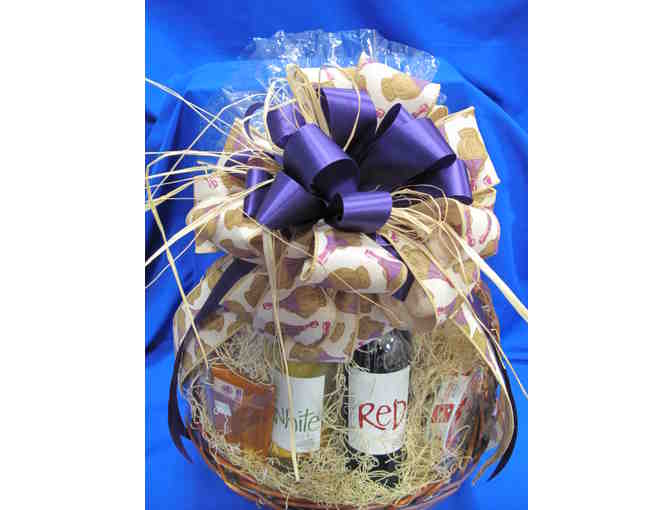 This beautiful wine basket is stuffed with 2 bottles of California wine (1 red, 1 white), cheese, crackers, nuts, cookies and chocolate.