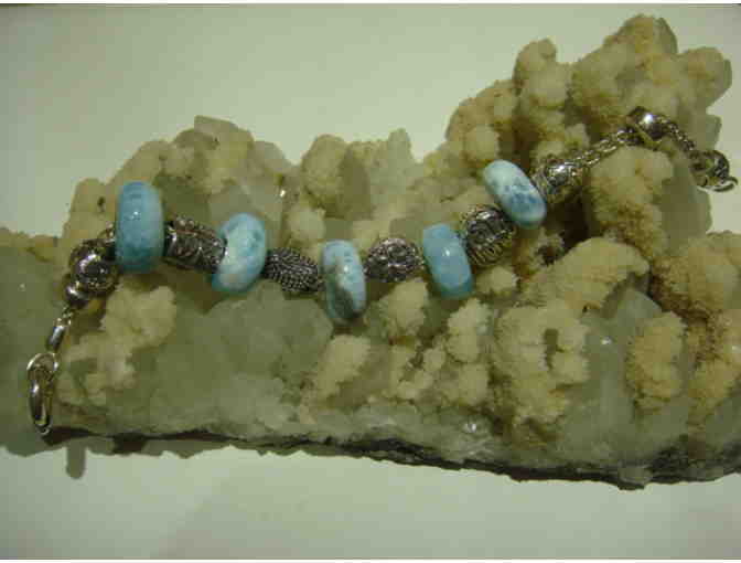 Sterling Silver Bauble Bead Bracelet with 5 hand cut larimar beads along with one Sea Turtle/St. John, one St. Thomas/Ship, one Sand Dollar/St. John, one Starfish/St. John, one Jost Van Dyke/Palm Tree and one Palm Tree/St. John bead.