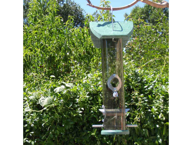 Feed the birds and nourish your eco-loving soul with this 18-inch-tall bird feeder, made from recycled plastics and metals. Pour one quart of safflower, sunflower or mixed seeds into the easy-to-access tube and you'll have set out a beckoning buffet for many types of birds, among them cardinals, chickadees, doves, finches, flickers, goldfinches, grackles, grosbeaks, jays, juncos, nuthatches, redpolls, siskins, sparrows, starlings, titmice, towhees, woodpeckers and wrens.
