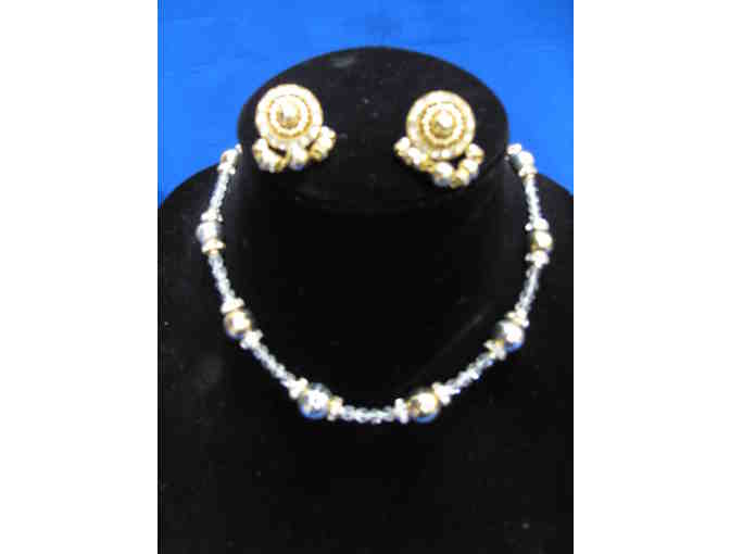This necklace and matched earring set features gold colored features and sparkling beads that beautifully reflect that light. Wearing these pieces are sure to light up your day.