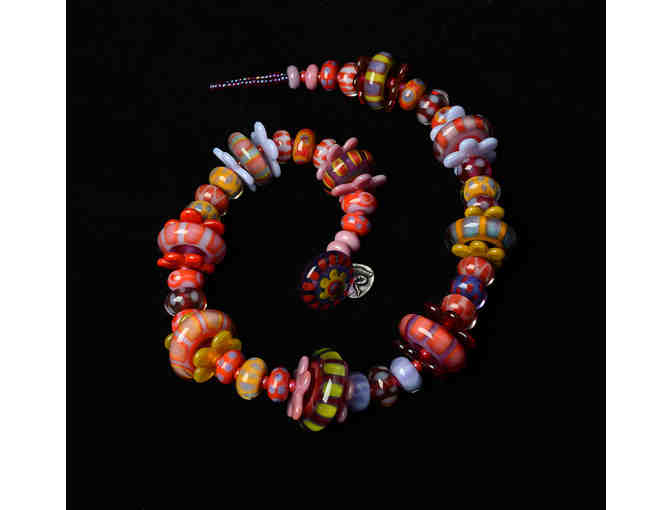 Each bead in this 18" long necklace is handmade, using the ancient technique of lampworking.