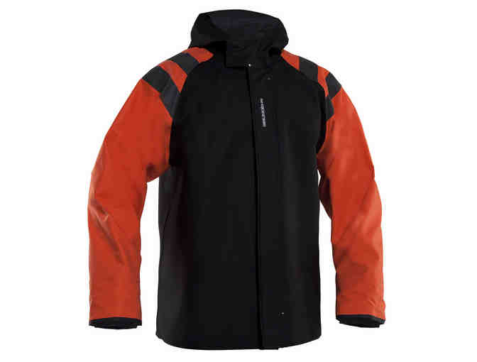 Grundens' Balder jacket and bib trousers are cut to enhance comfort, ventilation and mobility on deck. Black and orange, size large. The black sou'wester is made of hypalon coated canvas and flannel lined.