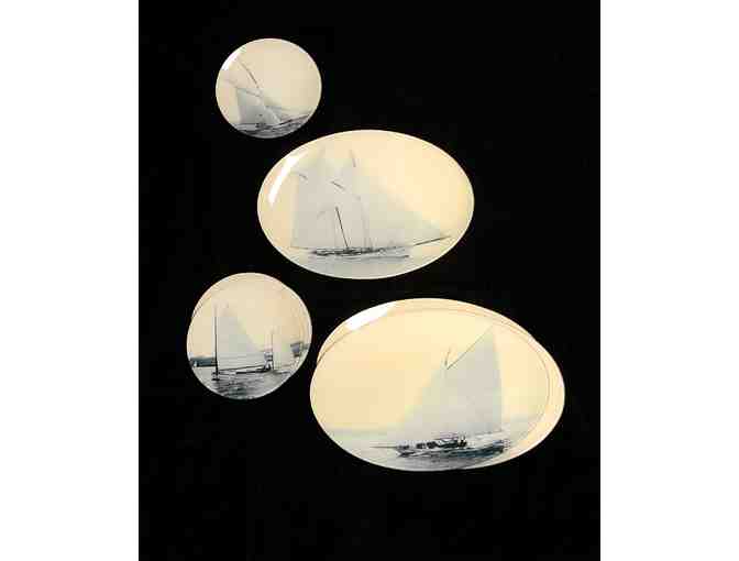 Two 10" x 14" signed decoupage platters with vintage yacht images, by artist John Derian. John's decoupage plates, platters, paperweights, coasters and bowls are handmade in his studio in New York City. (The round 7" plates in the picture are not included in this lot.)