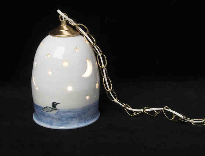Handmade on the potter's wheel, then cut and pierced with moon, stars and a loon.