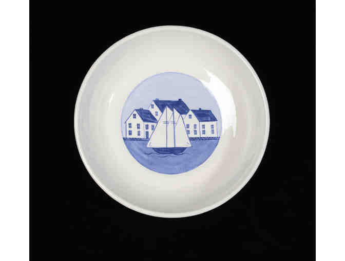 This 12" diameter, blue and white bowl depicts a coastal harbor scene.